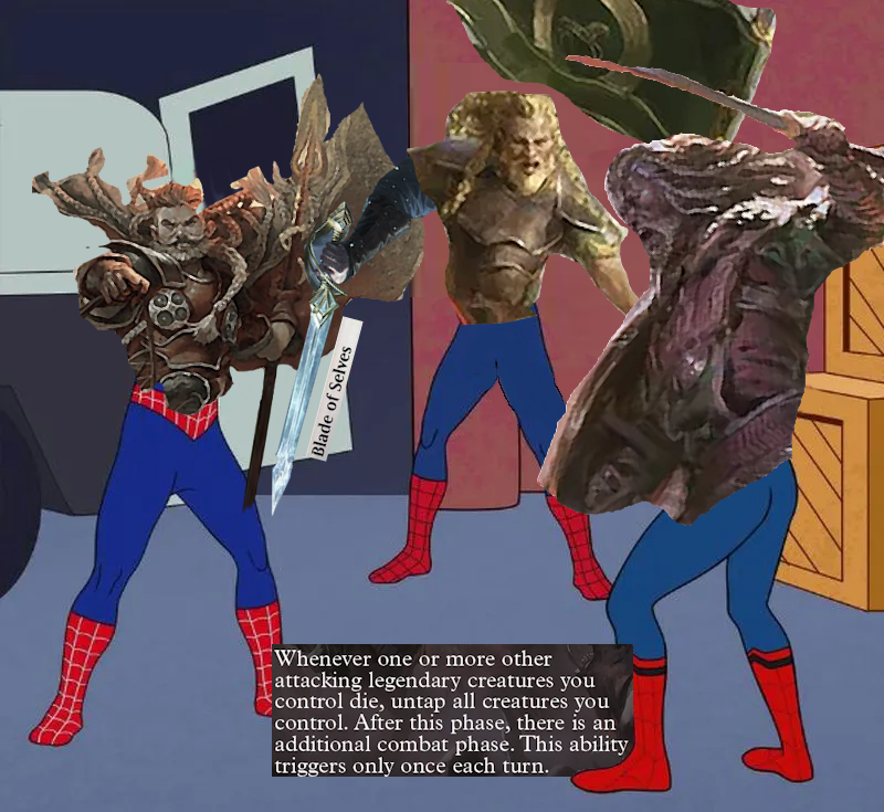Blade of Selves. By equipping the Blade, and attacking, the two Myriad tokens see one another dying and trigger individually. This means you can stack combats so long as you have 3 opponents, requiring you carefully math out the damage to leave each of them alive long enough to end the game in a single phase. It's a bit challenging, but with each piece being solid individually (Éomer seeing a stolen Commander die in combat is very common) we can steer into the combo while we're just doing our thing. We also have