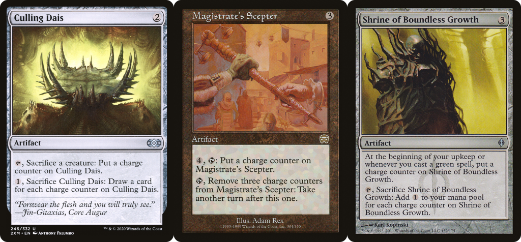 Shrine of Piercing Vision—after receiving a glut of counters from Spacecraft, these normally slow-to-build cards reach a fever pitch. The key word when thinking about boosting these Commanders to new heights is 'Acceleration', doing things far faster and more efficiently than a card was likely designed for. Strap that V8 engine to your jalopy, and re-contextualize the power of these forgotten Artifacts.