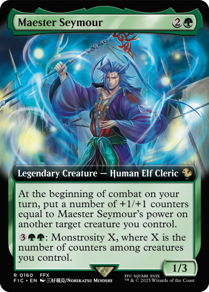 Sword of the Paruns. This category of 'Green mana dork that goes infinite with a repeatable untap effect' is a dime a dozen, and certainly makes for a path towards victory. That being said, our Commander isn't technically a mana outlet, meaning you'll need some third piece to actually push to the endgame. This comes down to Monstrosity not only being once-per-Creature, but also Seymour's ability to spread that power being locked to once per Combat. To some extent, this goes to show why Seymour is arguably better as a combo-free Commander, given as soon as you attempt to evaluate him as such he loses out to other options. In Seymour's own funny little world of animate Artifacts, however, he's a Maester of his domain.