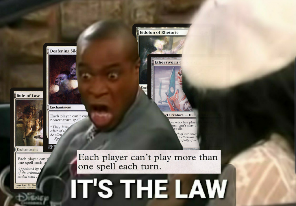 Normally the downside to loading your opponents up with oodles of resources is the inevitable fact that, gasp, they get to actually play out those cards. This is a tragedy indeed for decks like Nekusar, who aim to finish the game before the overwhelming advantage accumulation comes back to bite them, but for Monowhite, we lack the luxury of that burning clock. What White does provide, however, is the capability to limit our opponents' abilities to empty their hands by playing their cards, through Rule of Law effects. Even if our opponents have a grip of 7+ cards, we need only worry about the single scariest card on a given turn, outside of instant-speed play. This also puts a massive crunch on control decks that might want to interact multiple times on the stack, or combo decks that need to resolve several key pieces in a single turn to win; these are incidentals for us, though they are the historical reason RoL effects see play in formats like Legacy & cEDH.