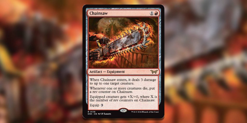 There's the honestly amazing Chainsaw card, a new red equipment that Bolts a creature when it comes into play, all the while gaining a rev counter anytime one or more creatures die. Once equipped with a creature, that creature gets +X/+0, with X equalling the number of rec counters on it.