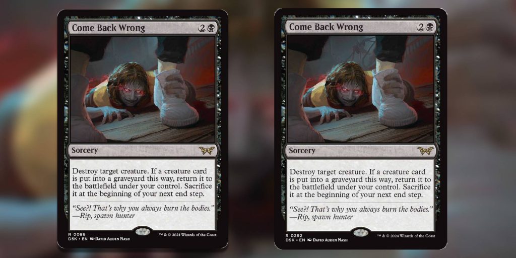 Tracking our plucky heroes is something much more sinister, and you can find it on the cards if you look closely enough. The card Come Back Wrong is a rare removal spell that destroys a creature and then brings it back to the battlefield under your control for the turn. But there are two versions of this card.