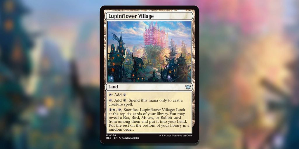 Let’s take a look at Lupinflower Village. This white land lets you sacrifice it to take a peek at the top six cards of your library to try and find a Bat, Bird, Mouse, or Rabbit card and put it into your hand. Each of these lands tap for a colorless mana, and then for a single color, like white, but only if you’re using it to cast a creature spell.