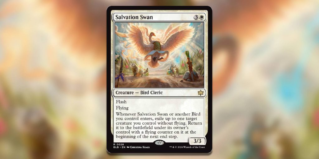 For something a little more impressive, there is Salvation Swan, a Bird Cleric that is reminiscent of Restoration Angel with both its ability and artwork. When this swan or another Bird creature comes into play, you can exile another creature you control without flying. That creature returns to the battlefield with a flying counter on it at the beginning of the next end step, making it a great single-use ability that can dodge practically any removal spell.