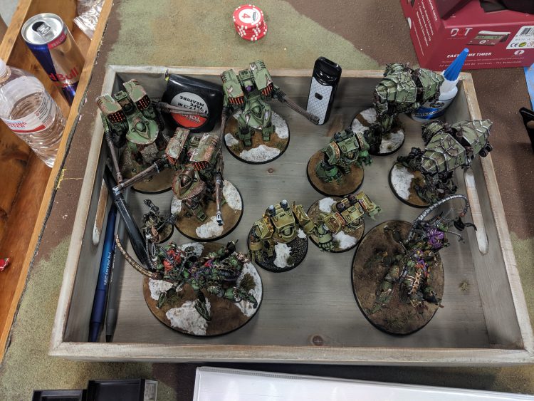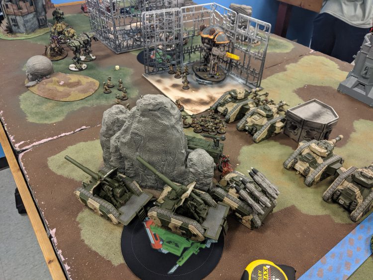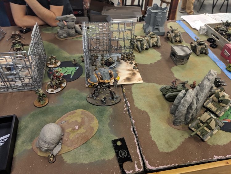 Nick opens up by running his Decimators, Contemptors, and Discolords around my left side of his NOVA L. His Cool Ranch Doritos largely hold position on my right side of his NOVA L. His turn one shooting consisted of killing about 20 to 25 Guardsmen and putting 11 wounds on Knighty Boi with soulburners. Nick passes the turn.