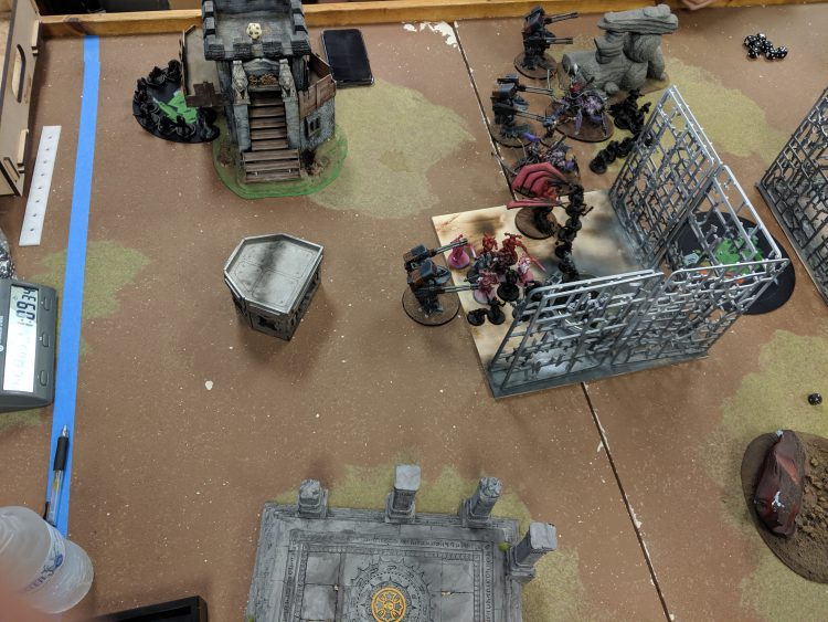 For those of you keeping track at home, that's over half of the units in Nick's army. We chat a little bit after that turn and both agree that he's in a pretty unrecoverable nosedive at this point. He's got no way to feasibly kill any of my heavy lifters and his movement on his Discolord is completely locked down by 10 idiots standing 3.1" away from him. We decide to just play it out anyways because there's still ways for him to score some pretty fast and easy points.