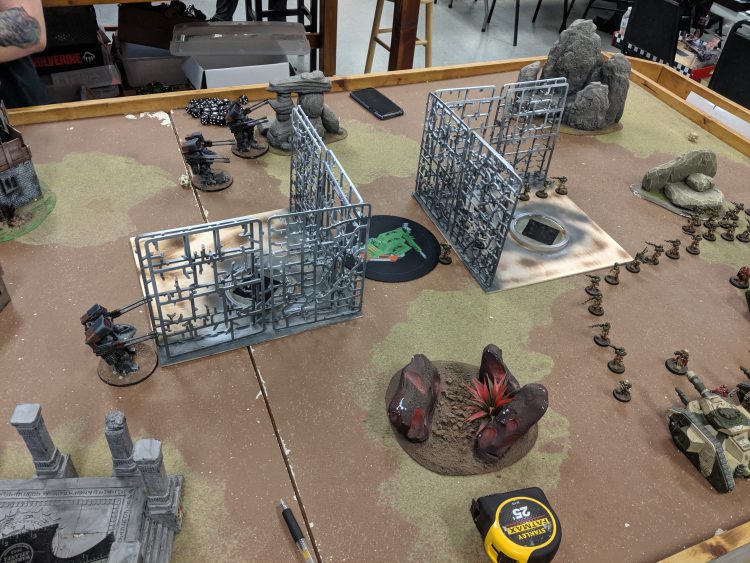 Sam's turn 2, he brings in his 'Zerkers on my extreme left with the chance to charge my knight and a squad of Guardsmen. He doesn't turn around with a Dorito and focuses on shooting what he's able to, which mostly consists of clearing out Guardsmen. He makes the charge on my Knight with 'Zerkers but fails with his drill. The Gallant is left with 1 wound after the first 'Zerker activation. I interrupt and kill 5-6. He kills me with his second activation. I fight on death with my Gallant and kill 5-6 more 'Zerkers. He ends with 5-6 of his 'Zerkers and his drill, ass in the wind hanging out in front of pissed off Cadians.