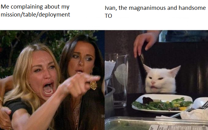 NOPE! You read that correctly dear unfortunate reader. I'm playing the same mission as last episode WITH the same deployment against a similar matchup. Don't worry it gets better. It's at the same table. But fear not dear readers, upon receiving this pairing I made sure to convey my feelings on the matter to Ivan, the TO. Don't worry we're probably still friends. Probably.