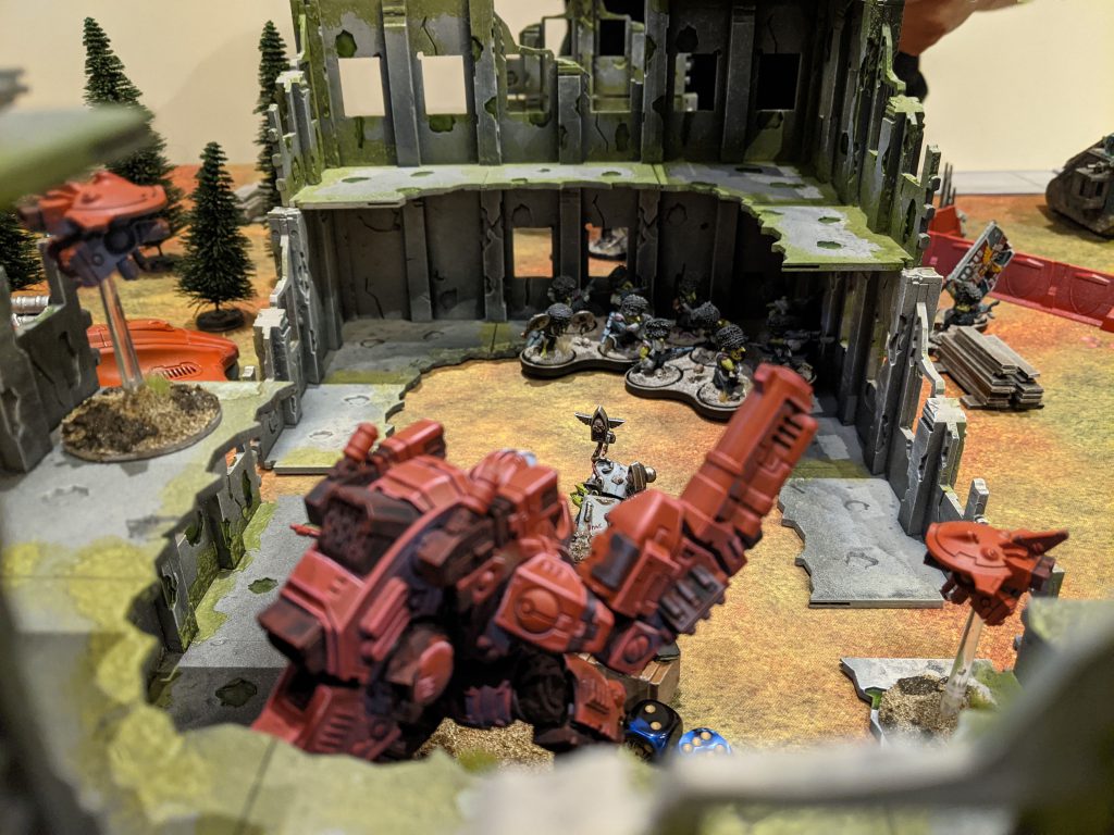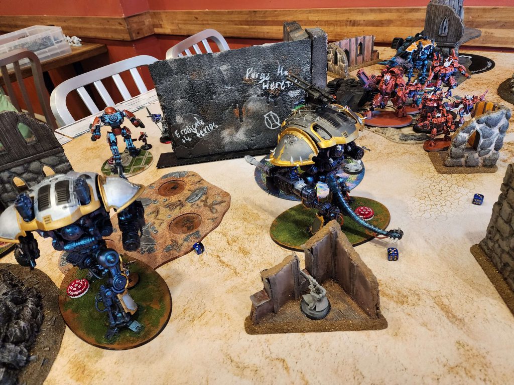 I figured for my first games, I might as well run all my cool Kill Team models, along with all my bigger toys. Big mistake! My first match was against a fellow Kill Teammate Isaias on Imperial Knights. That first game took over 4 hours as we muddled through the phases and rolled a crazy amount of dice. I suspect in our first turn of 40k we rolled more dice than a player does during a tournament day of KT. Luckily railguns, seeker missiles, and hot cyclic ions were able to down enough Knights to get me a 10 point victory.