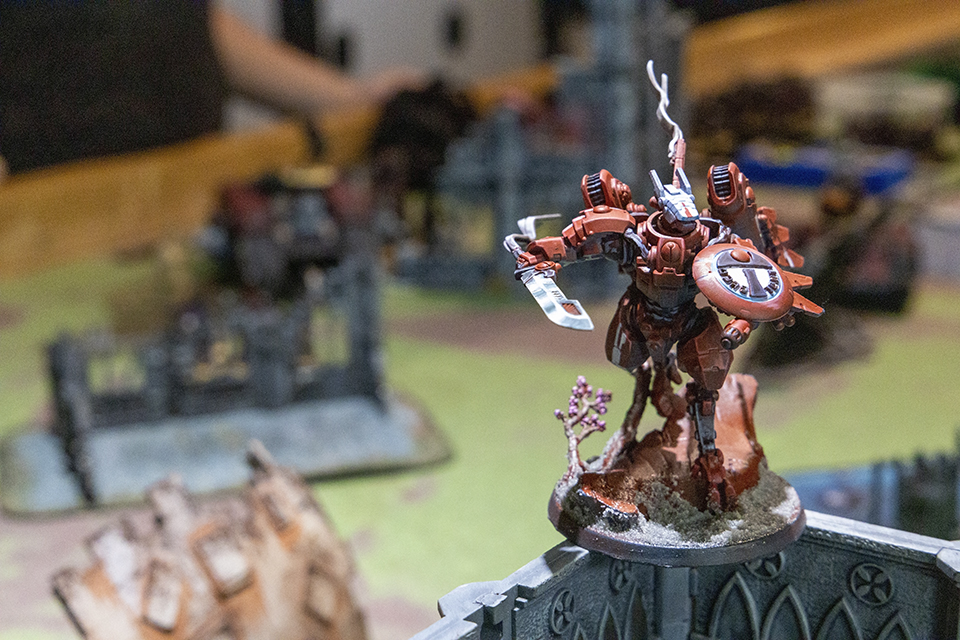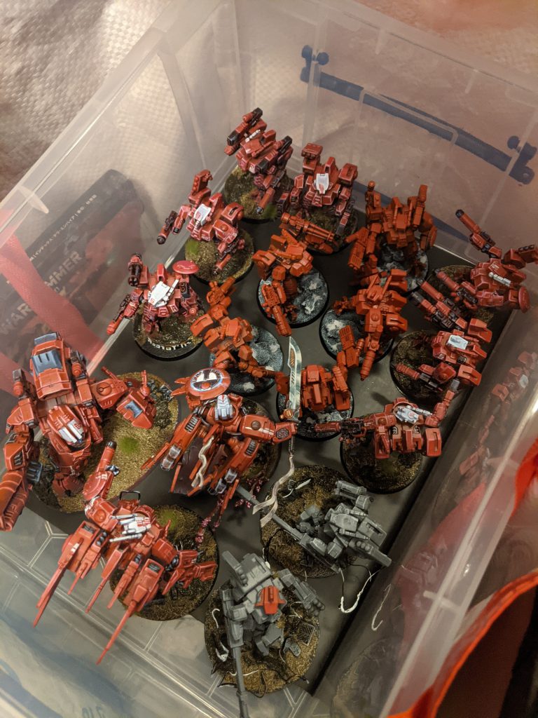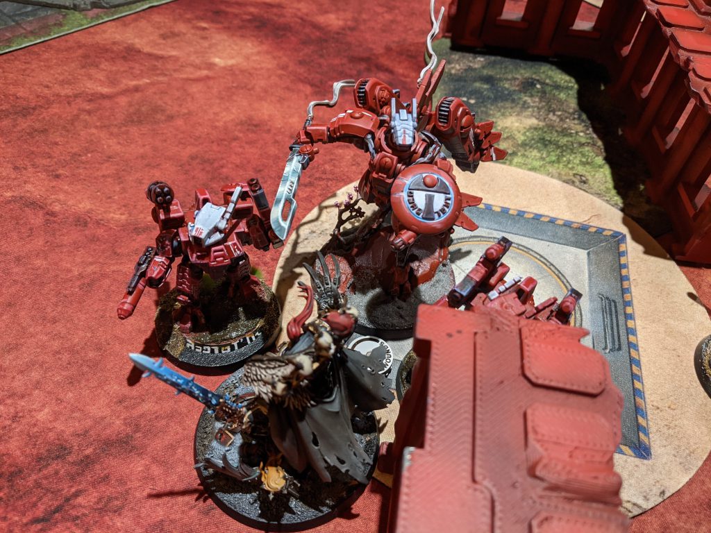 With those few changes I played against a friend's beautifully painted skitarii list, which seemed to us absolutely terrible without enough damage to reliably threaten any of my suits. Then against a combined arms Adeptus Sororitas list which also seemed to bounce harmlessly off of my crisis suits. I wasn’t sure if my wins were due to my opponents lists or mine. My list seemed totally able to adapt to both big knights and smaller arms so I said why not, and locked it in for a local RTT.
