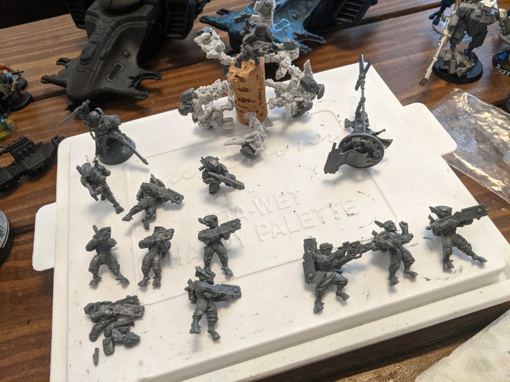 My first task was to build. That meant assembling new Breachers and suits of varying sizes and figuring out painting and storage solutions for everything. Going from a skirmish game to one where I'd be fielding 60+ models certainly required a commitment to differently scaled solutions for painting, storage, and transport. The scale of work is not something I was looking forward to, but painting legions of ITD terrain for tournaments has given me some helpful experience on the matter.