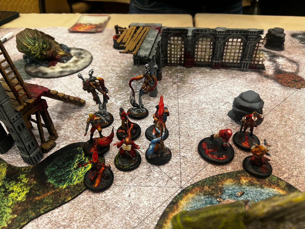 I played Turn 1 pretty cagey, unwilling to let him spread too much flame on me. He did get one big Sapping Flames off, but I was able to remove two models' burning with Wesley's Sober Up while removing Wesley's burning with Hoochdini's I Need a Volunteer. That left me decently well protected, and the Shielded from Cooper Jones prevented me from suffering any Burning damage.