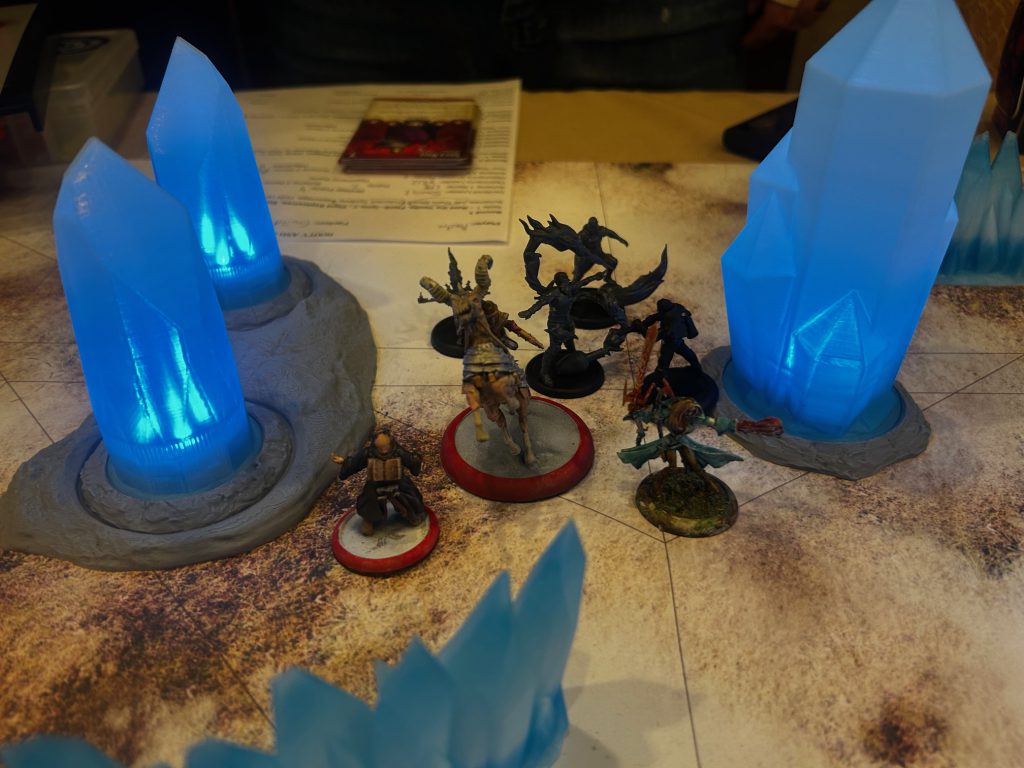 any of your models is dangerous since it lets her summon off you, so I just didn't clear the one random burning one of my Monks picked up from Rodriguez's Breath of Fire and thus let him summon a Witchling Thrall. I had a plan to zorch it with Hoochdini and use the Trapped Door trigger to send it where it could do no harm, but he had the Red Joker to beat my 13 of masks and so the thrall was able to unload on a Moon Shinobi who I had pushed up