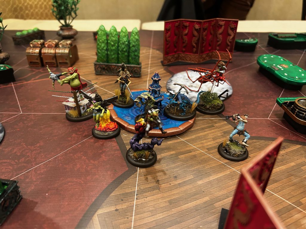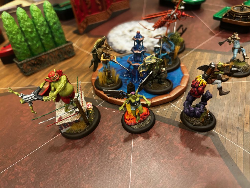 Talos, on the other hand, was pummeling my monks, and eventually both of them went down. I'm proud of them, though. The job of Fermented River Monks is being absurdly hard to kill, and they did it. Tara brawled a little with the Shinobi in her face and picked up Hoochdini when I got a little too aggressive with him, but she was forced to try to score both the strategy AND protected territory, as I put him on the latter scheme early and picked up the random markers he had been throwing down.