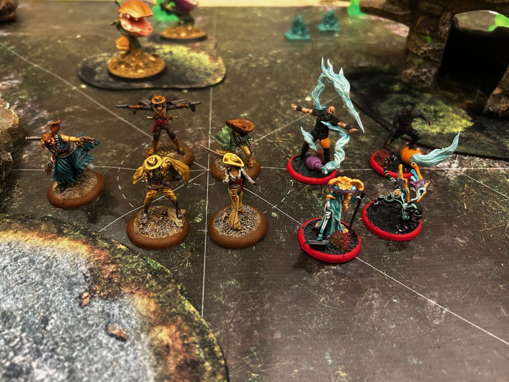 Turn 2, the Watcher ran in and Delivered a Message, which was expected; I killed it pretty easily and also poured damage into Joss. I needed him dead before he could start deconstructing my crew. Gavin's Soulstone Miners popped up near my backfield objectives, which was annoying, but I knew I had some time to clear them out. Bogg and Vantes held down the right flank, with Vantes engaging Melissa at 2" to make shooting difficult for her.