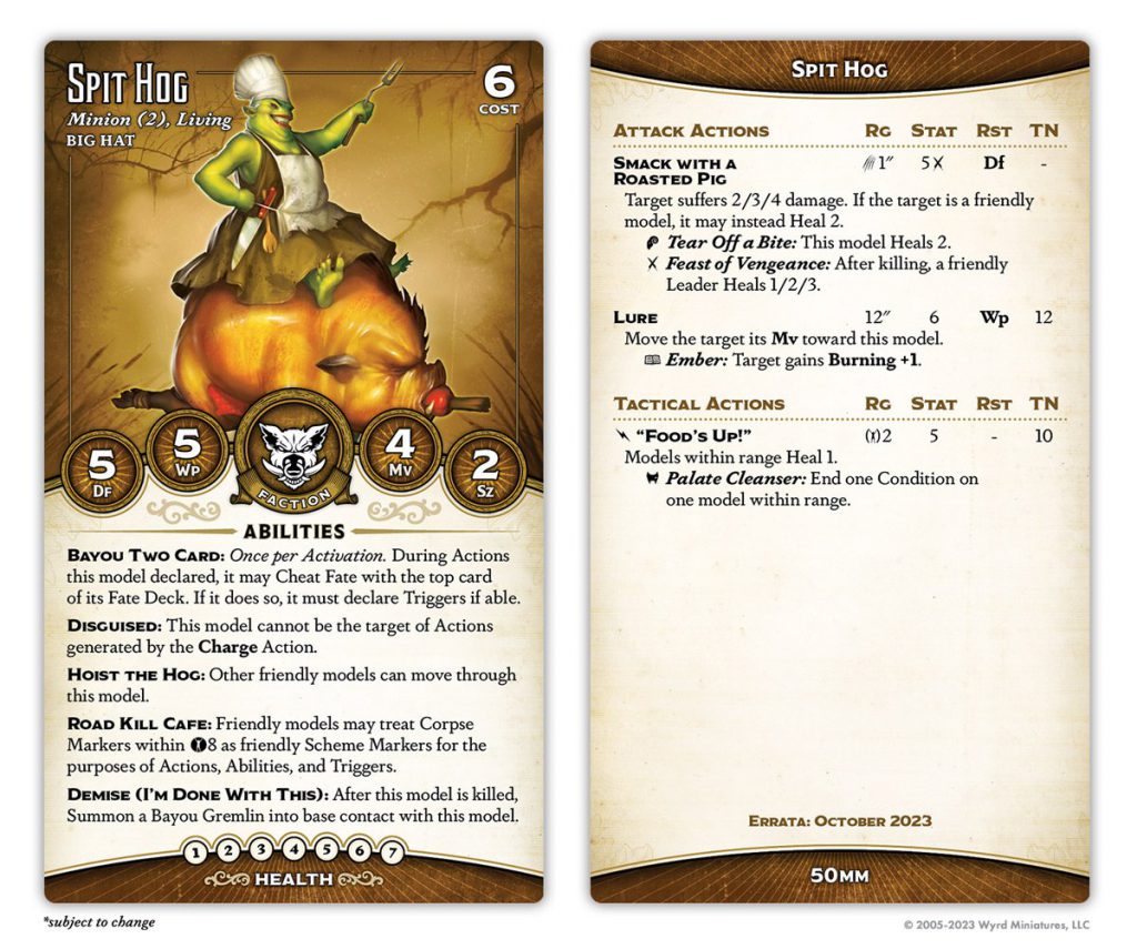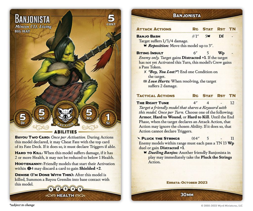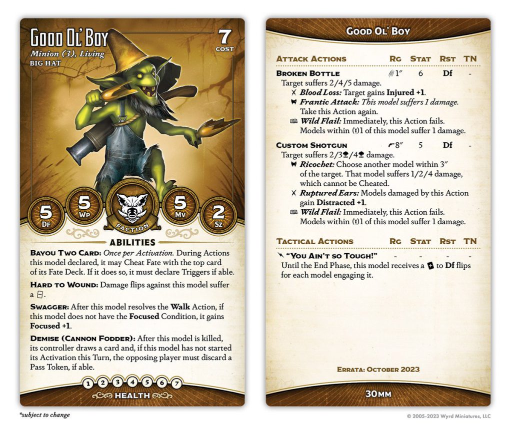 Big Hat's "combat minion" has always suffered from the limitations imposed by Bayou Bash, but with the change to Bayou Two Card they've come into their own. They've lost Bring It! (sort of - their bonus action turns it back on for the turn, but that means they have to activate). They've also upgraded their Demise to Cannon Fodder, which as noted is very strong, though it