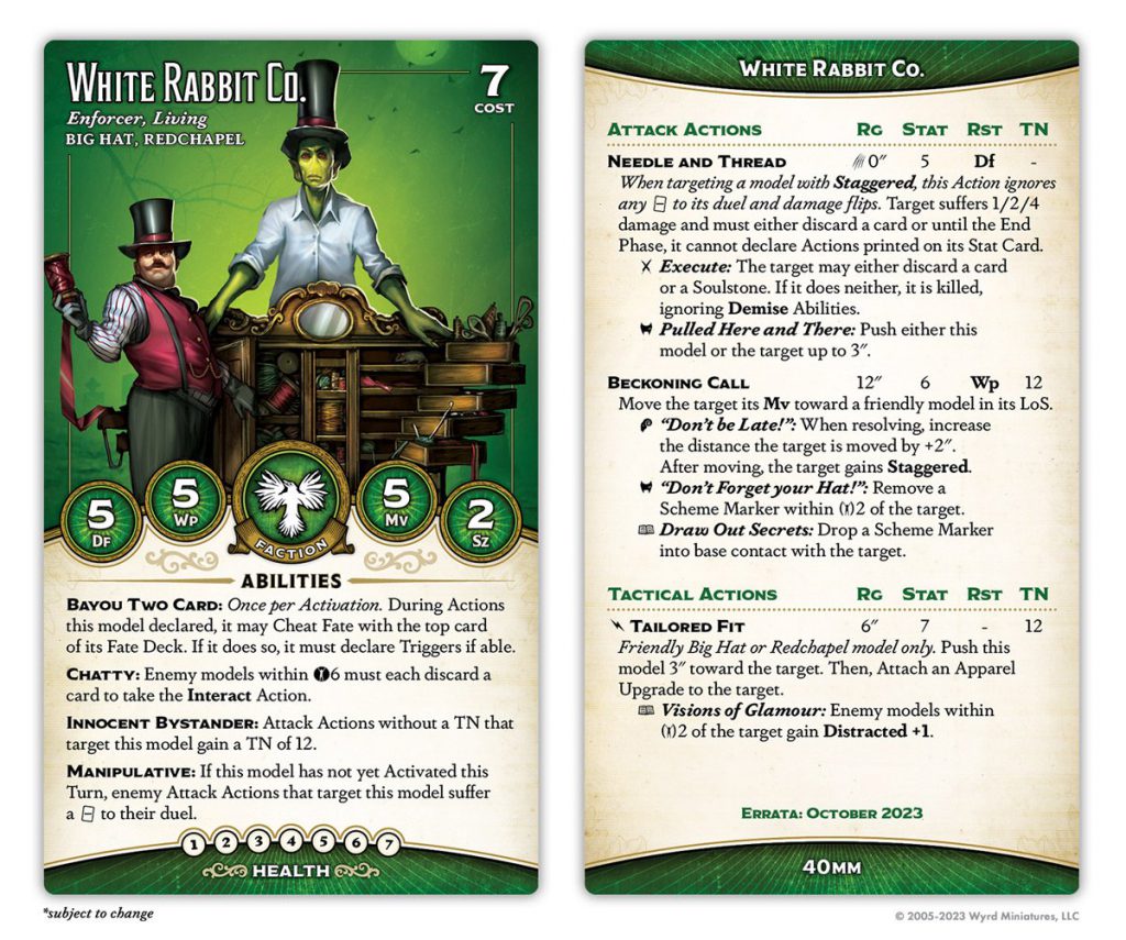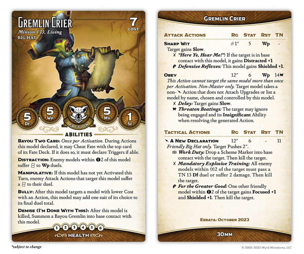 Malifaux has never really had a true "horde" playstyle, partially because of how punishing losing activation control is, and partially because of how the game's resource system encourages hiring a small number of elite models you can feed cards and AP to. This is, I think, the first "horde" crew to really look like it has a shot. It's early days yet, so even if Big Hat ends up strong, I don't know if good Big Hat lists will go all-in on summoning Gremlins, but you're certainly being pushed in that direction.