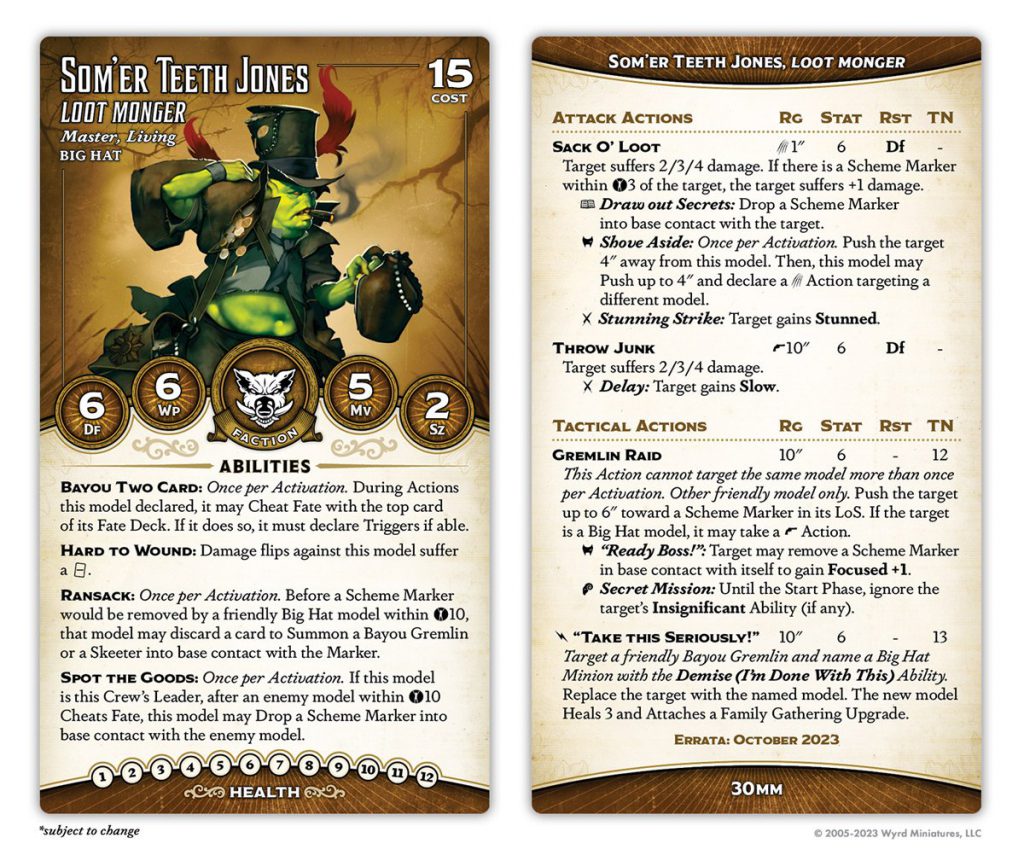 Som'er's title was always a neat concept let down by execution. He traded his summons for some decent attacks and solid crew buffs, paired with an interesting "scheme marker removal" subtheme that let him both generate scheme markers and cash them in for Bayou Gremlins. The core problem was that, outside of Som'er himself, the Big Hat keyword wasn't particularly effective at