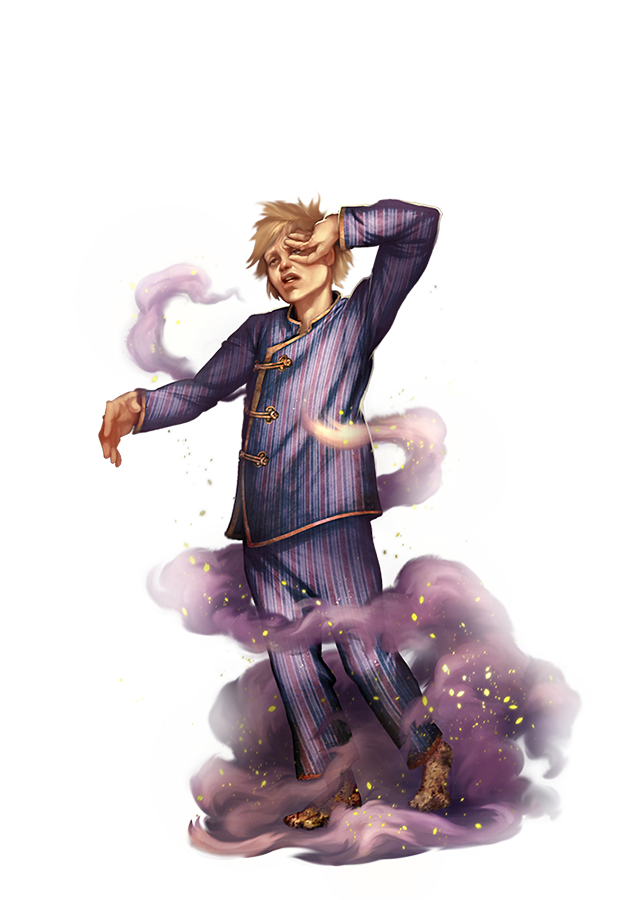 Balanced between Woe and Performer, he's quite a bit more of the former than the latter; he has Misery and Opportunist like all Woes, though his condition of choice is Distracted, which admittedly Performers are