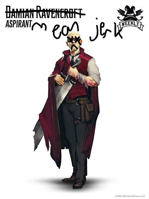Especially for a game as complex as Malifaux. Now, Malifaux doesn't have a playerbase as big as MTG, or even Warhammer - it takes longer for the metagame to be "solved" and for consensus to arise on what's good and what's not. But ever since he released at Gencon 2022, it's been clear that Damian Ravencroft was... a problem. Andre Demings of the Texas Malifaux community took him to the Las Vegas Open and ran the table, crushing all competition, then traveled to New England for Captaincon and crushed his way through two tournaments there, too. Damian is pretty strong at mid-tables but