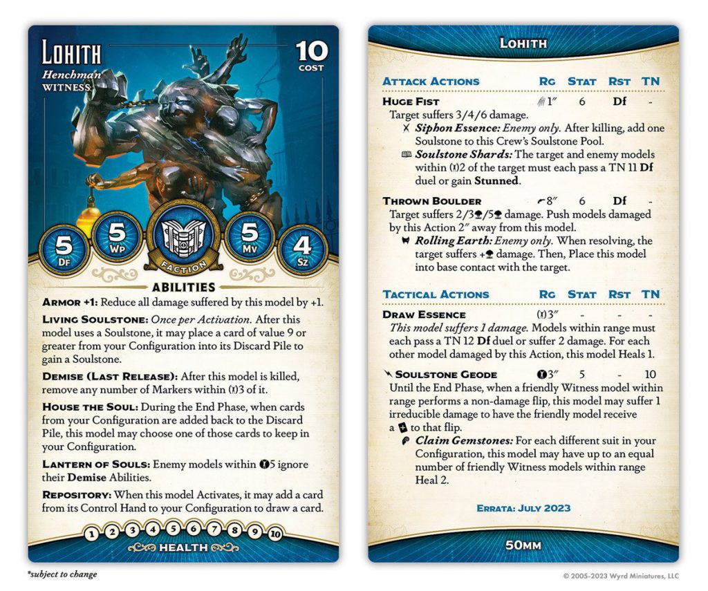 Overall, while it's too early to really rate Damian Unbound, he's unquestionably a lot weaker than his former incarnation, especially with the other nerfs to the keyword. Still, it's not all doom and gloom for Witness players. Damian Ravencroft, Aspirant was nearly as good as his title - absolutely still a broken master - and his card didn't change at all (though the Configuration changes, and the change to Lohith, will both serve to tune him down). I personally think he may be in line for adjustments even after this, since Maintain Order is a really, really gruesome ability to not have a range limit. Marco Bonatti and Miya Murakami are likewise A+ models that didn't get touched aside from the general Configuration change, which does hurt them both but probably not fatally.