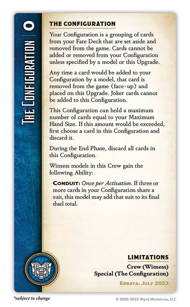 I'm not sure if anyone expected a change to the Configuration itself, but here it is. The change is subtle but tremendous: the Conduit ability, which grants Witness models free suits, is now
