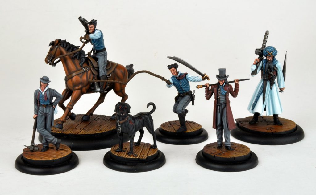 Lucas McCabe, Dismounted McCabe, Luna, Sidir Alchibal and two Ruffians. Credit: Dave Taylor Miniatures