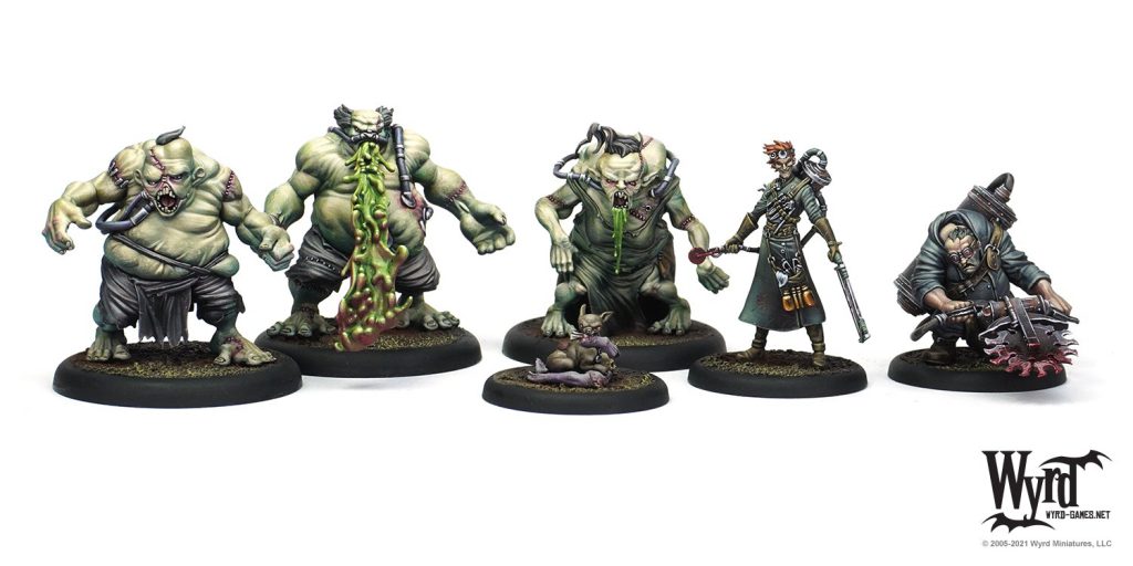 Dr. McMourning, Sebastian, the Zombie Chihuahua, and three Flesh Constructs. Credit: Wyrd Games