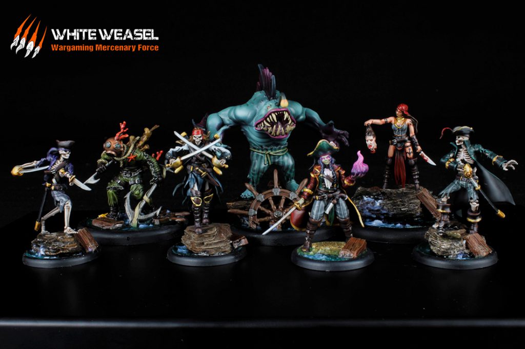 L-R: A Skellywag, the Wayward Mariner, another Skellywag, the Salty Seadevil, Captain Mary "Blacktongue" Bonnet, Nani and the Voice, and a third Skellywag. Credit: White Weasel Studios