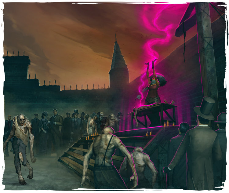 There are forms of magic in Malifaux that simply did not exist on Earth prior to the opening of the Breach. Of these, the most notorious (and dangerous) is necromancy-- or, as it is more commonly known, "Resurrectionism." Resurrectionism comes from the Grave Spirit, the force of death summoned by Titania in Malifaux's mythic past. The Spirit's presence in Malifaux's aether is what allows Resurrectionists to make the dead walk. Ancient, forbidden tomes carry the secrets to life after death. Such magic is universally proscribed; the Guild confiscates necromantic lore and kills or imprisons its owners on sight. And if that were all there was to Resurrectionism, it might be just another minor threat in a world all too full of them.
