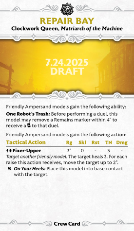Let's start with Matriarch of the Machine - specifically with her crew card. Repair Bay is (almost) as straightforward as crew cards get: One Robot's Trash lets you convert Remains Markers directly to +twists to duels.