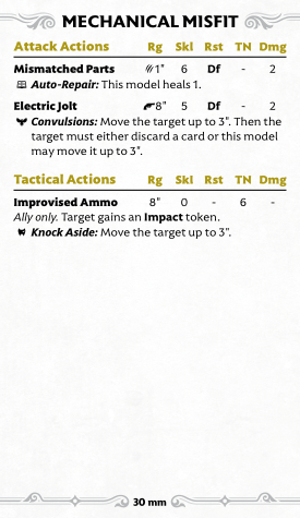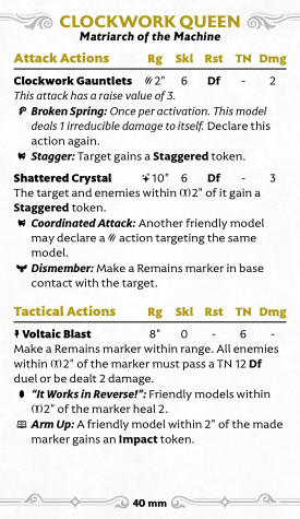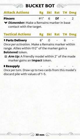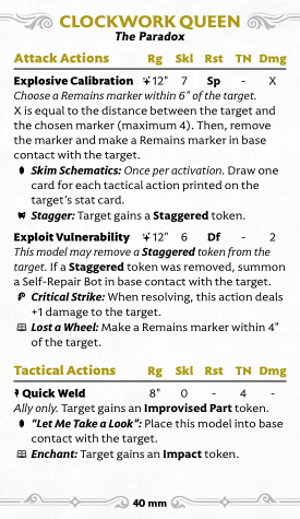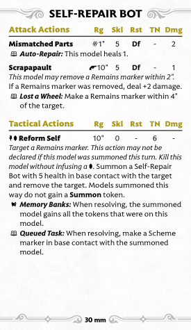 remove Staggered from the enemy to summon Self-Repair Bots (of which more later) into base contact with them, which is cute. It has crit strike, which is always nice to have, and the Lost a Wheel ability to make a Remains marker within 4", which is more significant (since it turns on Calibration).
