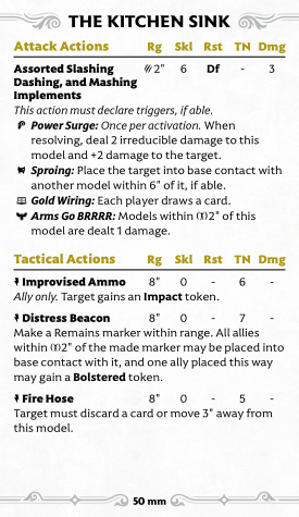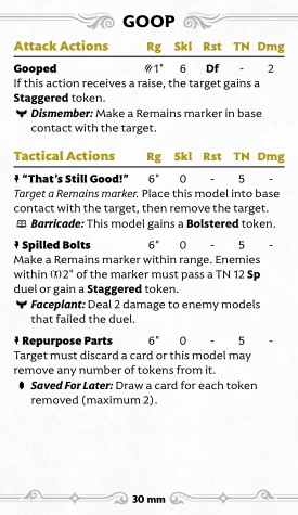 Goop's melee isn't great, but Staggering enemies at least turns on his boss's summon. His tactical are much more interesting: there are three, and they're all Signature actions, which gives you a ton of versatility. Spilled Bolts simply creates Remains within 6", turning on many other crew abilities, and occasionally Staggering and even damaging enemies near the marker. "That's Still Good!", on the other hand, hoovers up a Remains marker to teleport Goop around and maybe even Bolster him. Finally, Repurpose Parts lets you eat tokens off friendlies