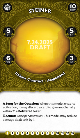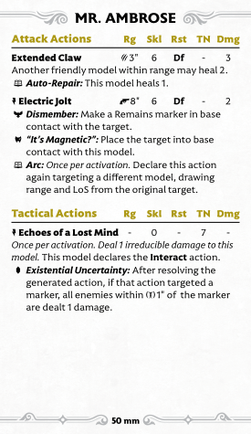 Extended Claw is a nice surprise on a model like this; while Ambrose is mostly a scheme runner, a 3" range 3 damage attack is solid, and it even hands out a little dash of healing (to himself and others). His gun is a signature action, so he can technically play gun turret, but it's short-ranged and low-ish damage - though the "It's Magnetic?" trigger is