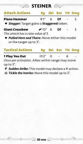 always been good in Malifaux: aoe movement helps you unpack, and though the range is short, Steiner's 50mm base means you can catch everyone you need to. It's only once per activation, but since it gives you either a 3" movement or a free attack, it's a good action even later in the game. This is probably the best action to copy with Improvised Parts, and handing out lots of Parts means even you cheap crappy minions will be pushing your whole crew up the board.