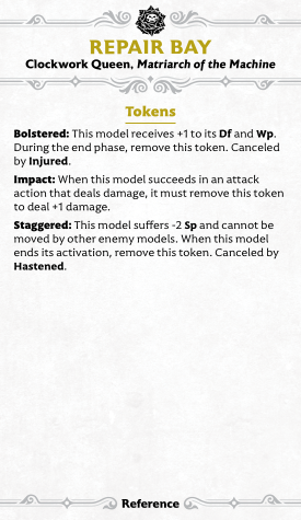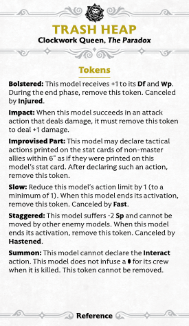 someone is getting torched for 6 damage. Presumably they're getting brained by a ballistic washing machine. Overall, though, this is a bit of a low-impact crew card... at least, on this side. The array of tokens is more interesting, including as it does the unique Improvised Part token. This allows models to declare tactical actions printed on the cards of non-master allies within 6". You only get one before removing the token, but that opens up amazing possibilities, as we will see below.
