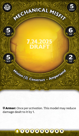 The first of Ampersand's two minions, these are a bit more fragile than Mechanical Misfits, but... in an odd way. 5 health with 5/5 defensive stats is "get murdered" territory, though Hard to Kill means it'll take two attacks. The bots have a crappy melee attack you never want to use, a not-quite-as-crappy ranged attack that can make Remains (and can cash them in to shoot for 3 damage, but not super reliably, since you must remove it before you see if you hit with your stat 5 attack), and a very odd tactical.