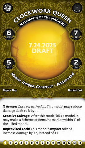 The Paradox switches her other form's Df and Wp, and is a lot slower at Mv 5, but is otherwise the same (armor included). She doesn't have Matriarch's double-impacts or Creative Salvage, but once per turn she can instantly gobble up a Remains marker that would be placed within 6" to infuse a Soulstone. An ability to reliably print Soulstones is great, and she even has a good spender: her defensive ability, Reverse Gyros, lets her spin a soulstone to move someone who attacked her 6", which is long enough that it will often both keep you safe and disrupt your opponent's plans. It doesn't reduce damage, though, and she doesn't have the massive healing potential of her original form, so beware.