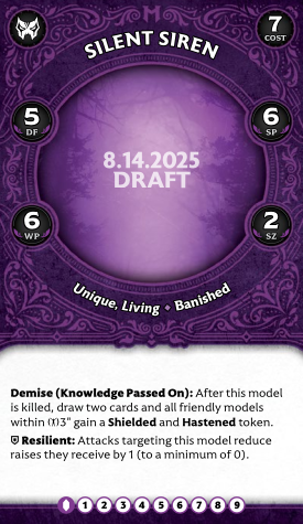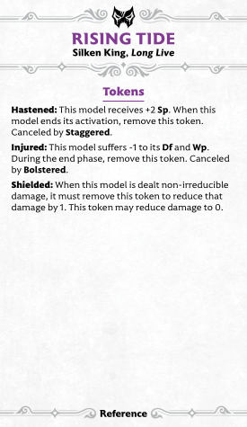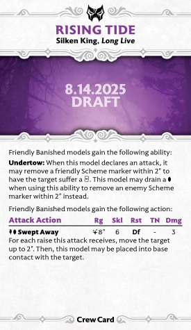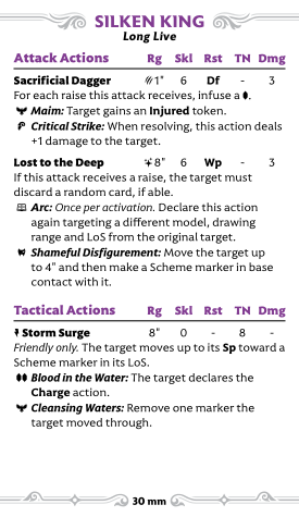 Starting with the Silken King's original form, Long Live, we'll look at his crew card. Rising Tide has a simple passive effect: any of your models can eat a friendly Scheme Marker within 2" to put opponents on a -twist to resist any attack. Negative twists to