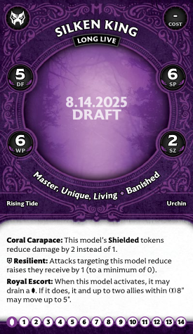 The Silken King's original form has what you might call Archetypical Master Stats: 5/6 defensive stats, 14 health, and 6 mv. He's pretty durable, as Resilient reduces raises against him by 1; this is basically 1 point of damage reduction, with the upside that it is 1) not once per activation (like many similar abilities) and 2) able to cancel various non-damaging raise effects, but the downside that it is 3) sometimes completely blank. His other piece of defensive tech, Coral Carapace, makes his Shielded tokens reduce damage by 2 instead of 1, which is great when you remember what Shielded tokens can reduce damage to 0. His last front-of-card ability, Royal Escort, lets you burn a Soulstone to get a free 5" move at the start of your activation alongside two friends. This is basically "burn a Soulstone for an AP" and is thus great, with the added bonus of bringing other models along. You will do this a lot.
