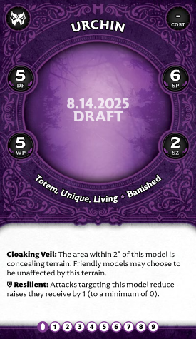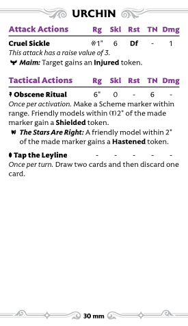 Long Live's totem, Urchin, has "totem stats" (i.e. 5s defensively and 9 health), although it shares its master's Resilient and its Cloaking Veil will make your opponent burn a card to hit it a lot of the time. It also has an attack that benefits from raises well, though the base damage of 1 is just not impressive enough to make this something worth burning resources for. Its tacticals are what you want: Tap the Leyline is your standard totem-draw ability, trading off the guaranteed suits (and +1 net card) from Resupply for the chance of drawing high cards off the top of your deck. Obscene Ritual makes a Scheme Marker within 6" to set up the crew card ability, and also pulses out Shielded to keep his boss alive. He can even hand out Hastened tokens for a little surprising speed.