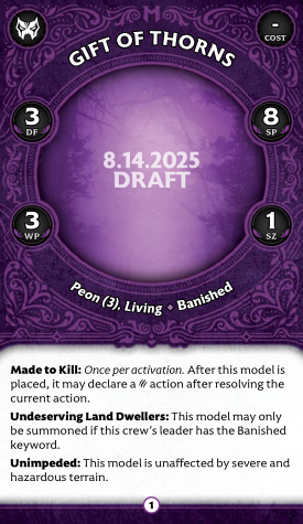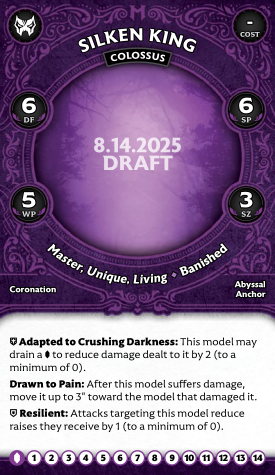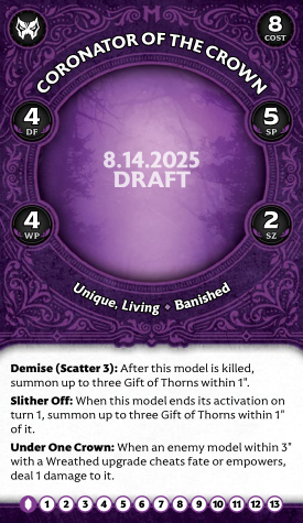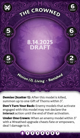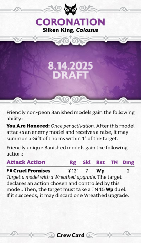 The Silken King's title form, Colossus, has a unique play pattern that focuses on Crowns of Thorns, which I will describe alongside him. His crew card, Coronation, gives all non-peon Banished (remember that restriction) the ability to summon a Gift of Thorns whenever they get a Raise in an attack on an enemy, once per activation. Friendly unique Banished models gain the Cruel Promises signature action. This costs a Soulstone, but has Range 12 and Stat 7 vs. Wp, making it very reliable. It deals 2 damage and forces the target to take an action you control. What's the catch? Well, to be eligible to be targeted, the enemy must have a Wreathed upgrade on them, and after the action resolves they get to take a TN 15 Wp duel to lose the upgrade.