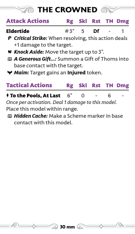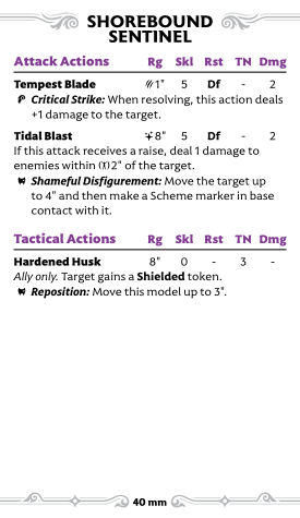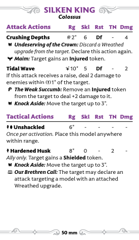 two Signature Tactical actions. Unshackled is just a 6" leap - There's no TN or anything, but it does cost a Soulstone, so you should consider when you really need it. Leaping your damage 4 beater into a convenient spot is pretty nasty, though. Hardened Husk just hands out Shielded to allies, which is simple and utilitarian, but it can also push them 3" or let them make an attack (not just a melee attack) into a Wreathed enemy. Note that you can Cruel Promises with this trigger, but you won't get to make the enemy take an action because a generated action cannot generate further actions unless it is Charge.