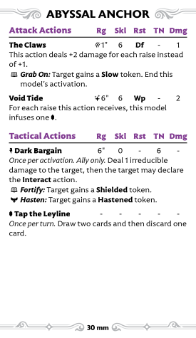 The Anchor's melee attack, the amusingly-named The Claws, deals +2 damage from raises, but at a base damage of 1 this is not setting the world on fire. It does have Grab On, so you can make enemies Slow at least. Void Tide is a much more interesting attack - a 6" range magic attack with just Damage 2, it generates a Soulstone for