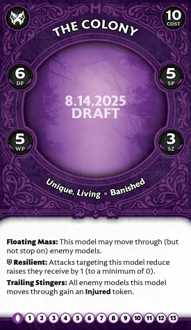 The Banished's 10-stone beefcake, the Colony is a hefty mass of Resilient wounds that won't go down easily. Floating Mass lets it pass through enemies, and Trailing Stingers gives them Injured when it does, which is a nice little incidental debuff that will make hitting enemies with your various gnarly attacks easier.