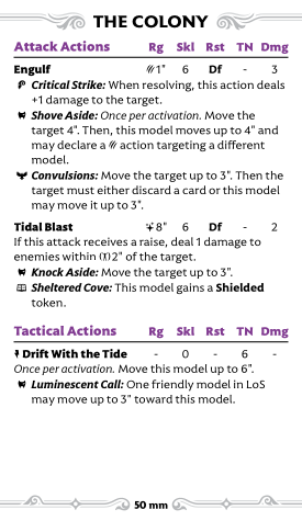 Speaking of gnarly attacks, the Colony has a bog-standard Stat 6, 3 damage swing with both Critical Strike and Shove Aside for bonus damage and extra attacks, respectively. Tidal Blast is not the world's most impressive ranged attack (though pulsing out damage on a Raise is nice), but being able to punt someone off a point from 8" away is not to be sneezed at. Drift With the Tide is what you want on a signature action: an extra AP, with the extra frisson here of being able to move through enemies and Injure them.