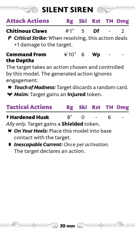 So what does she actually do? Well, Chitinous Claws is not a very impressive melee attack, even with Critical Strike. Instead, you will most often be using Command From the Depths: a range 10, stat 6 Obey. That is, for the uninitiated: an attack whose effect is to force the target to take an action under your control. This one can't target friendlies, as some can, but as some consolation it has no TN and allows the generated action to ignore engagement - letting your target charge or interact! It even has good triggers.