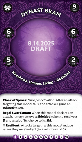 The other Banished minion, these are Colossus's friends. More expensive than Sentinels, with worse Df, less health, and no Resilient, they'll go down relatively quickly, but they're probably more useful until they do. They are like smaller versions of the Coronator, with his Under One Crown ability but only summoning one Gift when they die. Don't Turn Your Back is a strong rule, but they're not really tough enough to make good use of it except against enemy scheme runners.