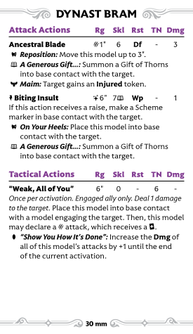 Bram's Signature attack, Biting Insult, only does 1 damage (with no more from Raises, since it's a magic attack), but it is Stat 7, and getting a Raise gives you a free Scheme Marker near the enemy, ready to be cashed in for Undertow. There's a built-in trigger to summon a Gift of Thorns, but you can also use On Your Heels to teleport into base contact with the target, ready to swing with the Ancestral Blade and use that newly made Scheme Marker for Undertow.