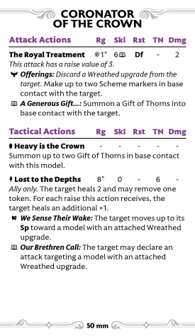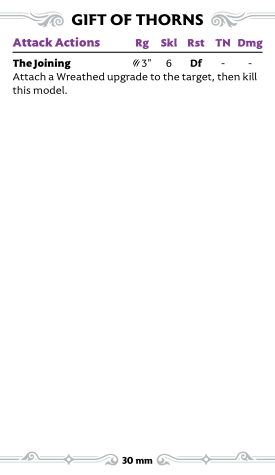 three Gift of Thorns within 1" of it. The dream, of course, is to summon them within 3" of three different enemy models, but that will require placing a slow and extremely vulnerable Coronator in a very dicey spot. Still, even if you can only end up near one enemy, you can get three chances to drop a Wreathed upgrade on them. You also get three Gifts when the Coronator